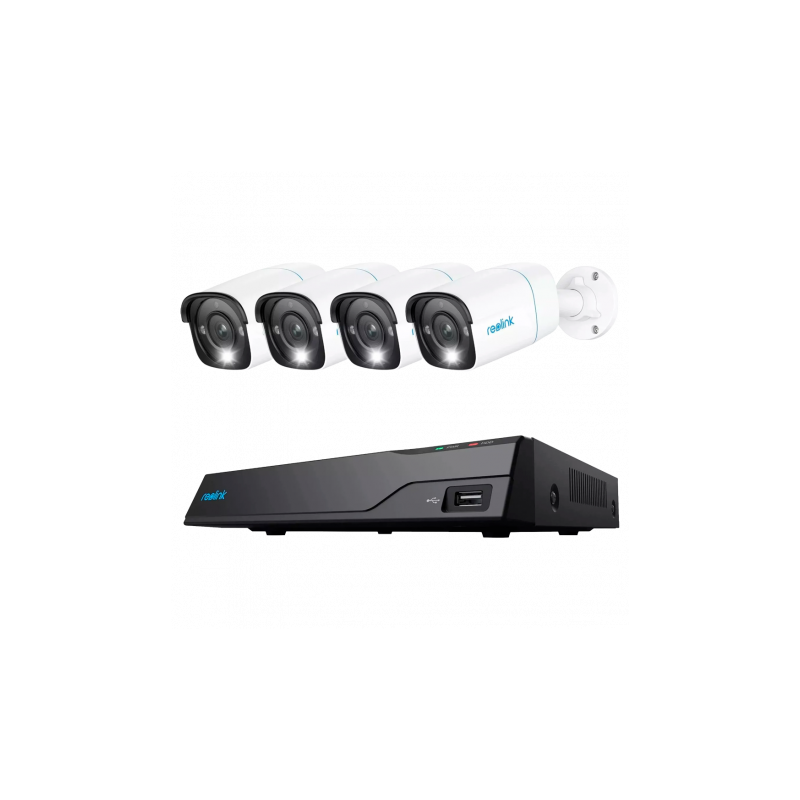 Kit NVR Reolink con funciones avanzadas, ideal para vigilancia exterior. Cámaras de 5MP, detección de humanos, mascotas y vehículos, almacenamiento de 2TB. Compatible con cámaras PoE y WiFi. Audio bidireccional, apto para condiciones climáticas adversas.