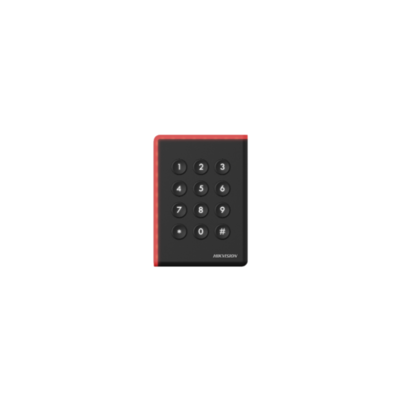 Lector de tarjetas EM 125Khz y teclado IP. Tipo de lector: Proximidad EM, teclado. Comunicación: Lectora/controladora/terminal mediante Wiegand, RS485. Montaje: Superficie. Protección IP65, protección antivandálica, temperatura de trabajo de -20 a 60ºC, alimentación 12 Vdc. Dimensiones: Alto 12,3 cm, ancho 8,8 cm, profundo 2,1 cm, peso 0,15 kg. Marca Hikvision Basic.
