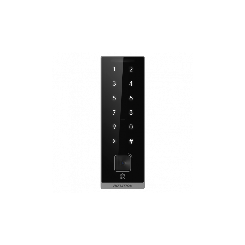 Lector de acceso para marcos, identificación por tarjeta MF DESFire, códigos QR y PIN, señalización LED y acústica, conexión mediante Wiegand 26/34 y RS485, instalación exterior con protección IP66. Compatible con controladoras Hikvision para una gestión segura y versátil de accesos.