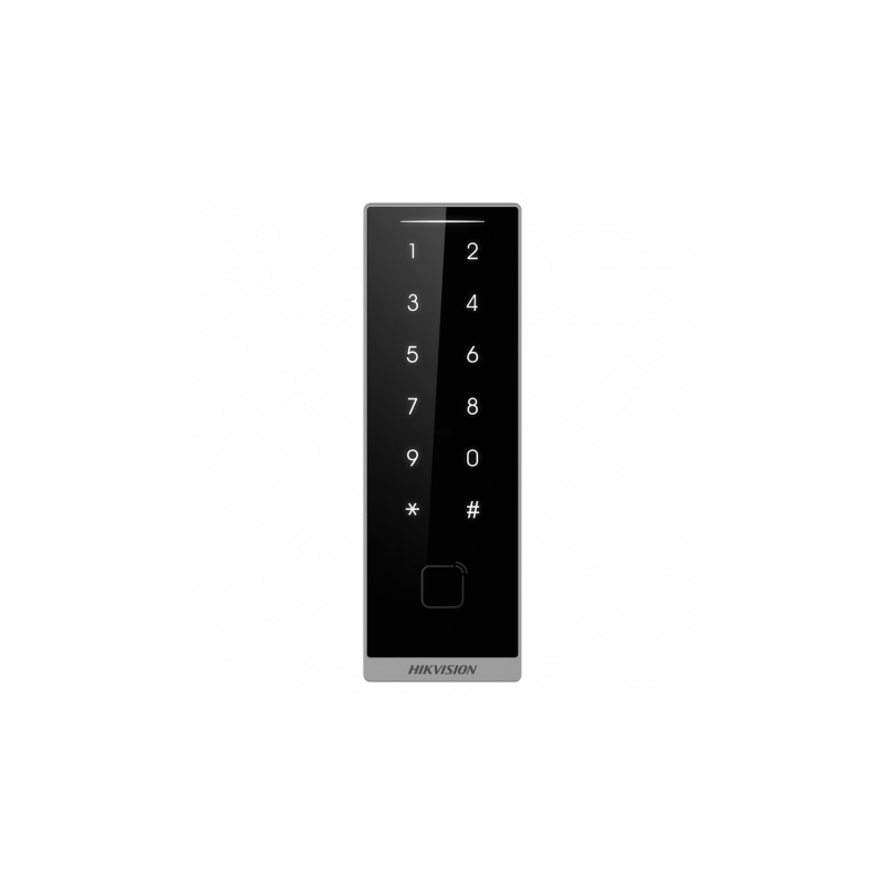Lector de acceso compacto para marcos, adecuado para entornos exteriores con protección IP66. Permite la identificación mediante tarjeta EM de 125 kHz, tarjeta MF de 13,56 MHz y PIN numérico, además de compatibilidad con Bluetooth a través de aplicaciones como HikCentral Mobile y HikConnect Teams. Integración mediante Wiegand de 26 a 34 y RS485, indicador LED y señal acústica. Instalación segura, diseñado para funcionar con controladoras Hikvision.