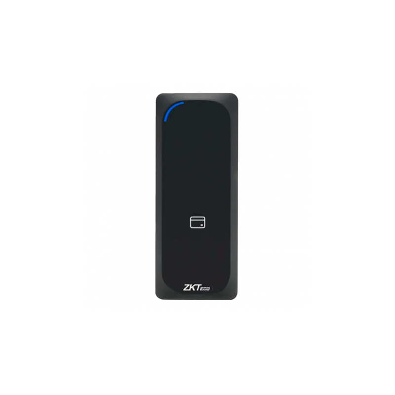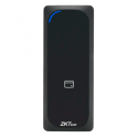 Lector para control de acceso diseñado para instalación en marcos, identificación mediante tarjeta RFID EM de 125 kHz, MF de 13.56 MHz y MF DESFire de 13.56 MHz, señalización mediante indicador LED y acústico. Conexión segura a controladoras mediante Wiegand 34, Wiegand 66 y RS485, diseño compacto, compatible con controladoras ZKTeco, uso en exterior gracias a su grado IP65.