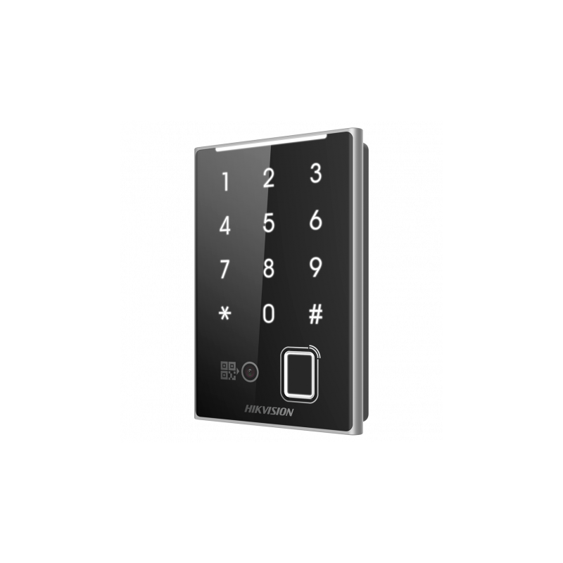Lector de acceso para controladora Hikvision, identificación por huella dactilar, tarjeta MF y MF DESFire de 13,56 MHz, QR y PIN, con indicador LED y avisos acústicos. Compatible con Wiegand 26 o 34 y RS485, apto para uso en exterior bajo protección IP65, apto para integración en sistemas de acceso con controladoras Hikvision.