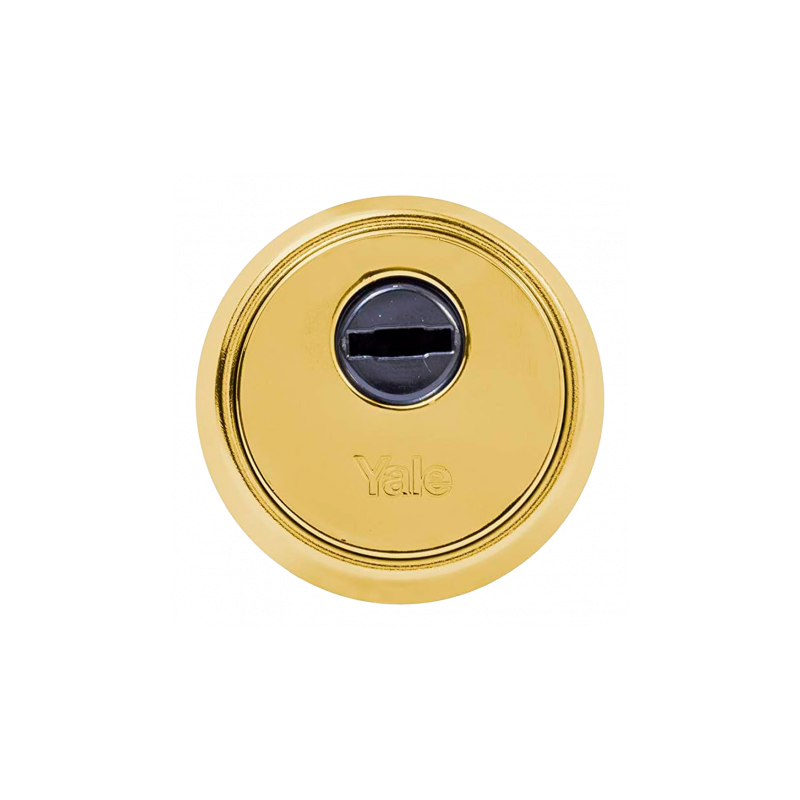 Escudo de seguridad Yale para cilindro de perfil europeo, protección avanzada contra rotura, extracción, taladro y mordaza, núcleo formado por dos placas de acero laminado, contraplaca interior en acero, protector de cilindro de acero carbonitrurado, casquillo giratorio de latón niquelado, fijación mediante dos tornillos de acero bonificado, acabado en color dorado.