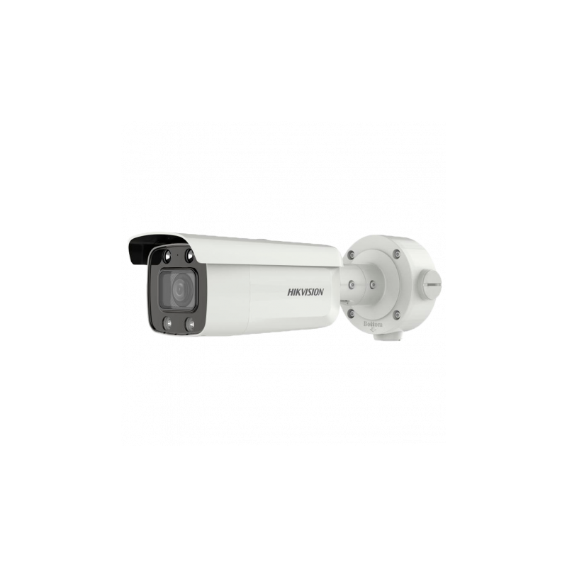 Cámara Bullet IP Hikvision LPR gama PRO con resolución de 4 Megapíxel (2688x1520), lente 2.8 a 12 mm, PoE, luz blanca 60 metros, tecnología AcuSense, reconocimiento de matrículas, detección de movimiento 2.0, y captura facial.