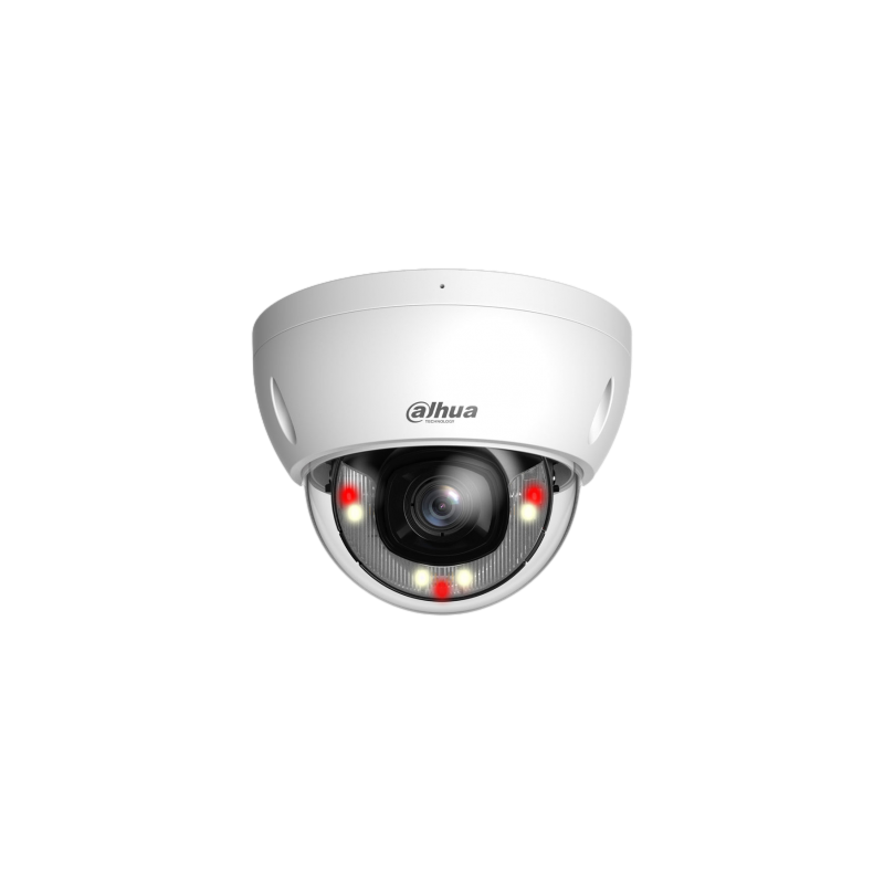 Domo IP Dahua WizSense 2, resolución de 6 megapíxeles a 20 imágenes por segundo y 4 megapíxeles a 25 o 30 imágenes por segundo, compresión de vídeo H.265 y Smart H.264 Plus y H.265 Plus, Smart Dual Light con infrarrojos y luz cálida con alcance de 30 metros, óptica fija de 2,8 milímetros, protección perimetral y SMD Plus, micrófono integrado, ranura MicroSD compatible con tarjetas de hasta 256 GB, protección IP67 e IK10, alimentación de 12 V CC y PoE.