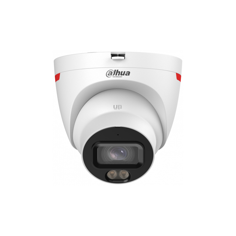 Cámara IP Dahua 4MP con gran sensor 1/1,8" CMOS, lente fija de 2,8 mm y tecnología WizColor para imagen a color 24/7. WDR 120 dB, luz cálida 30 m, SMD Plus con detección de personas y vehículos, micrófono integrado, PoE e índice de protección IP67 para interior y exterior.