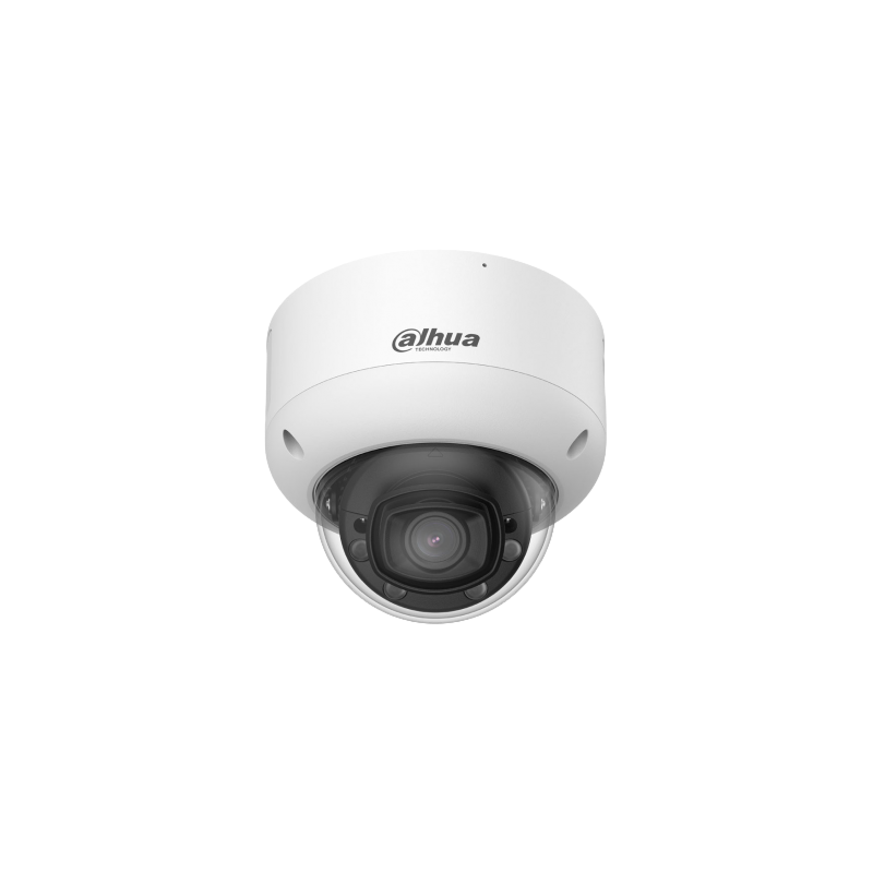 Domo IP Dahua WizMind con resolución de 4MP a 25 o 30 imágenes por segundo, sensor CMOS de 1/1.8 pulgadas, Smart Dual Light con alcance de infrarrojos hasta 60 metros y luz cálida hasta 50 metros, óptica fija de 2,8 mm, WDR de 140 dB, estabilización electrónica de imagen EIS y función Defog. Incluye funciones AcuPick, metadatos de vídeo, detección facial, protección perimetral y conteo de personas. Dispone de micrófono dual integrado y altavoz, 1 entrada y 1 salida de audio, 1 entrada y 1 salida de alarma, ranura para MicroSD de hasta 1 TB. Protección IP67 y resistencia antivandálica IK10. Alimentación PoE+, ePoE.