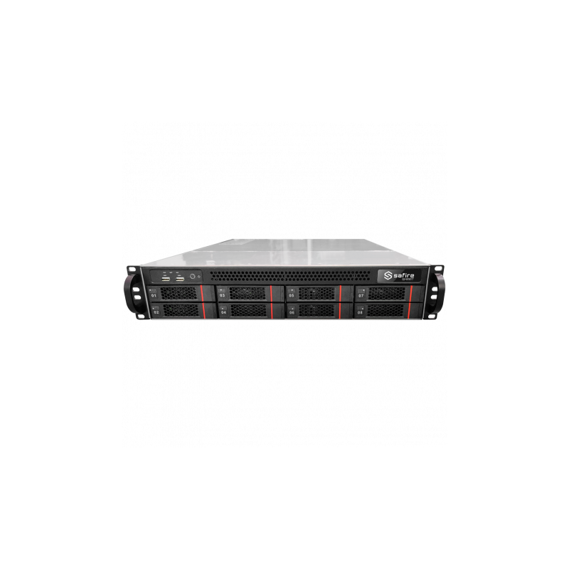 Safire Smart, servidor con VMS instalado, soporta hasta 1000 canales, admite 256 dispositivos, permite hasta 64 usuarios simultáneos, espacio para 8 discos duros de hasta 10TB cada uno, incluye sistema RAID y fuente de alimentación redundante, salida de vídeo a través de 4 puertos HDMI y 1 VGA, ancho de banda total de 768 Mbps, resolución máxima de 16 megapíxeles, funciones avanzadas como búsqueda inteligente de humanos, vehículos y vehículos de dos ruedas, reconocimiento facial, dewarping para cámaras Fisheye, alarmas y compatibilidad con ONVIF.