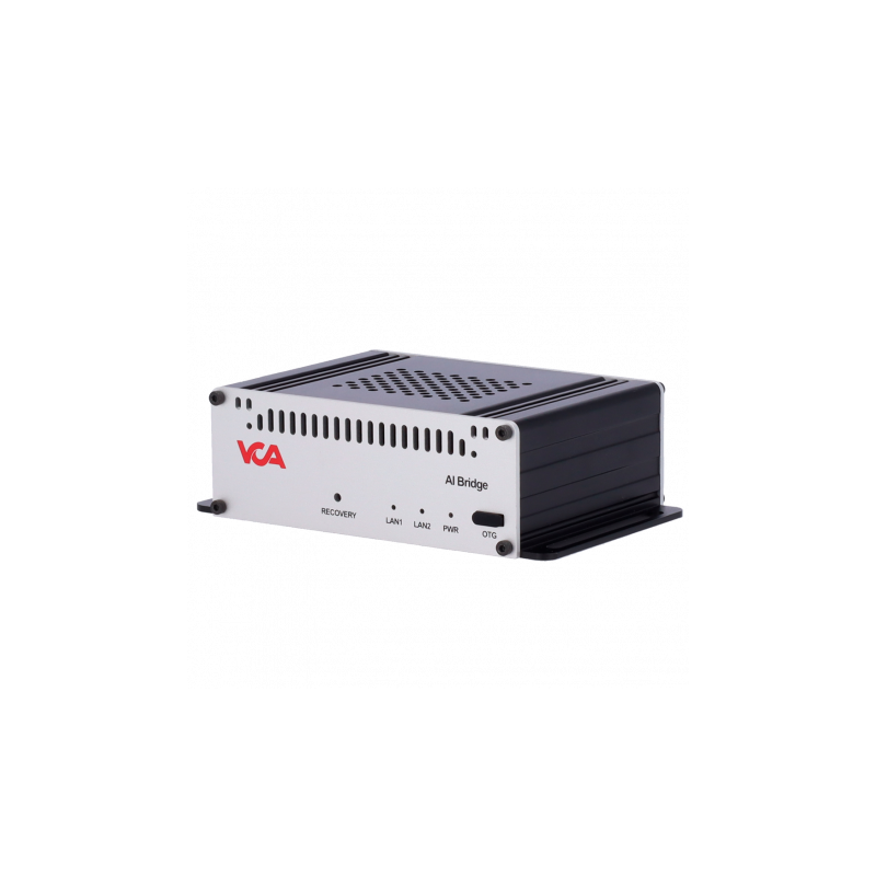 VCAserver AI Bridge modelo VCA-ABP302, núcleo Nvidia Jetson Orin Nano 8GB, almacenamiento interno de 250GB M.2 NVMe, sistema operativo Linux Ubuntu 22.04 LTS, pensado para procesamiento de analíticas de vídeo basadas en IA con arquitectura Ampere de 1024 núcleos y 32 Tensor cores, equipado con micro HDMI, 2 puertos Gigabit RJ45, dos entradas USB 3.1 tipo A, chasis industrial de metal en acabado plateado y negro, compatible con eventos VCA como intrusión, tamper, entrada y salida de zona, cruce de líneas, conteo de personas, objeto abandonado y removido, permanece operativo entre 0°C y 50°C, incluye cables y fuente de alimentación, no incluye licencias.