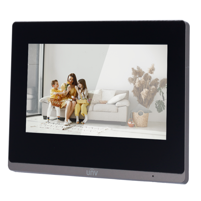Monitor interior de videoportero Uniview, pantalla TFT de 7 pulgadas táctil a color, micrófono y altavoz integrados, audio bidireccional, reducción de ruido y cancelación de eco, 8 entradas de alarma, 2 salidas de relé, ranura microSD, grabación y captura de imágenes, extensión múltiple de pantallas, TCP/IP y WiFi, PoE IEEE802.3af, llamadas internas entre dispositivos, montaje en superficie, notificaciones push mediante app UNV Link