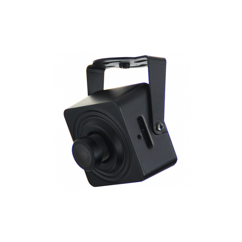 Mini cámara IP de 4 MP, lente fija 2.8 mm, WDR 120 dB, detección humana y de vehículos, micrófono integrado, PoE, carcasa metálica.