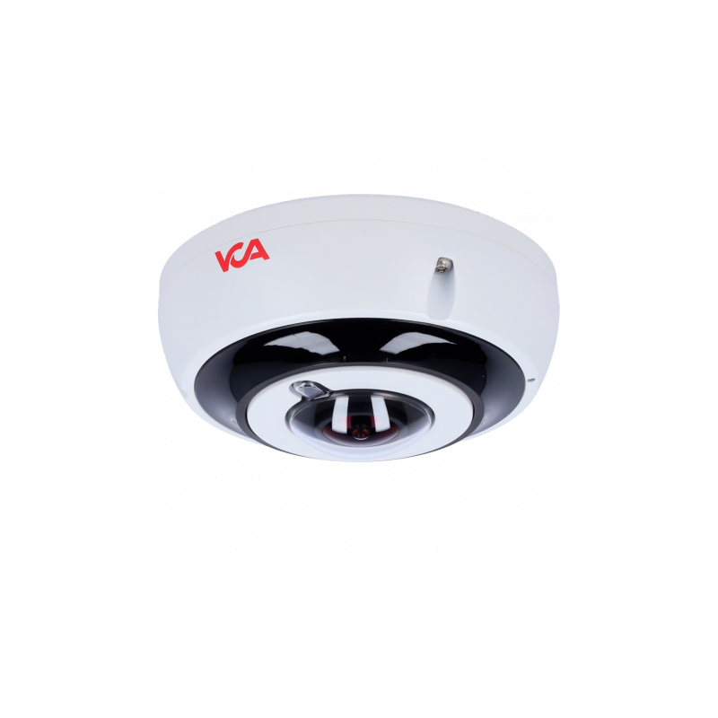 Cámara IP Fisheye 4K VCA, lente 1.5 mm, IR hasta 25 metros, analítica de video, ONVIF, IP67, IK10, carcasa de aluminio.