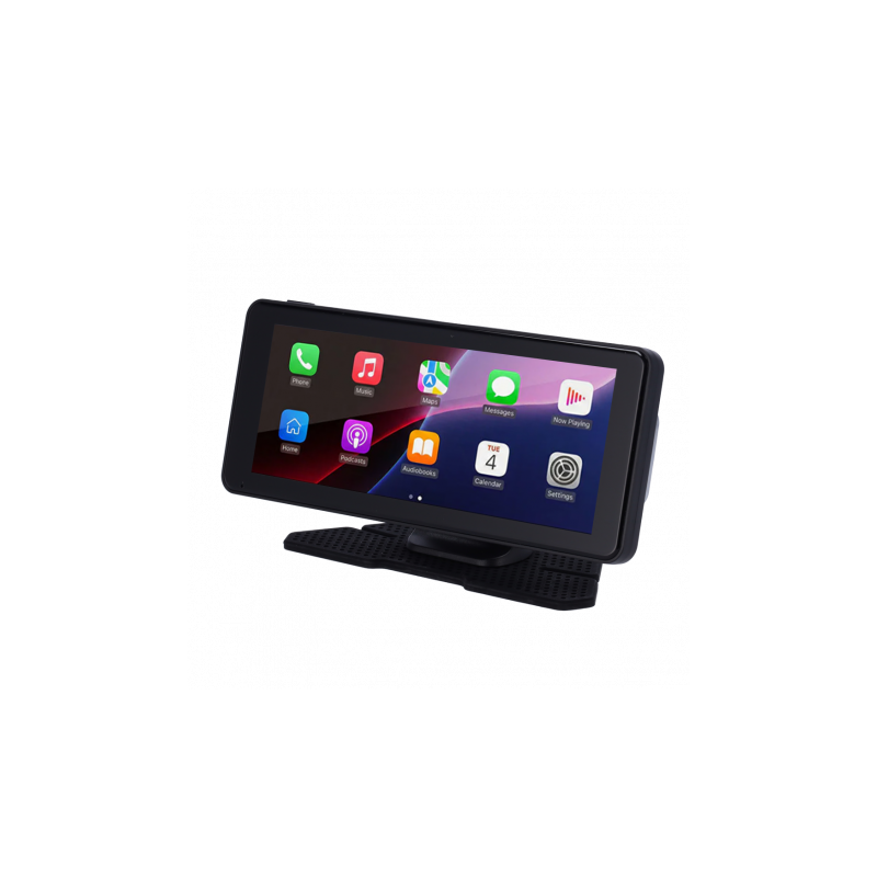 Carplay con pantalla táctil de 6,86 pulgadas, cámara frontal 4K y cámara trasera adicional 1080P, compatible con Android e IOS, grabación interna en tarjeta microSD hasta 256 GB. Visión trasera con ángulo de 150 grados, BLE 5.0, reproducción de video en local. Salidas de audio por altavoz integrado, emisora FM, conector de audio Jack y BLE. Incorpora acelerómetro integrado de 3 ejes, grabación en bucle, lapso de tiempo, protección contra borrado automático por colisión y posibilidad de realizar y recibir llamadas. Se incluye adaptador de alimentación a mechero y conexión de Carplay a USB-C.