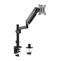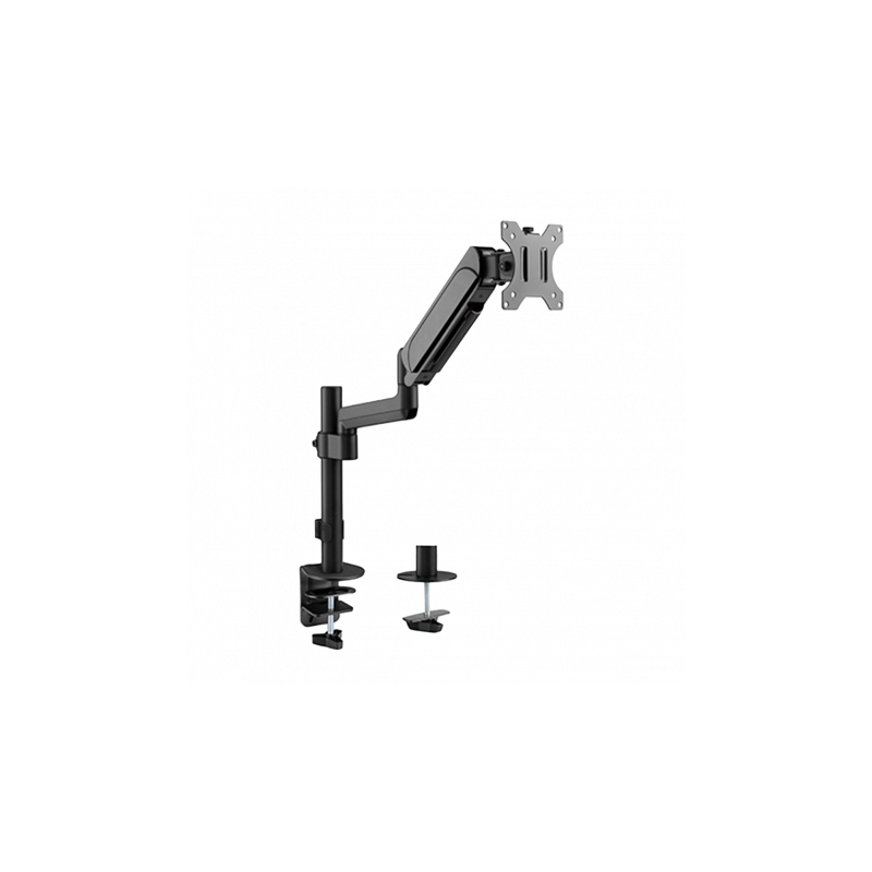 Brazo articulado de mesa para monitor, instalación directa en escritorio. Permite ajuste ergonómico del monitor en altura e inclinación, con capacidad de carga máxima de 9 kg, compatible con pantallas de 17 a 32 pulgadas, ángulo de inclinación de menos 45 a más 45 grados, rotación de menos 180 a más 180 grados, giro de menos 90 a más 90 grados, soporte VESA 75x75 y 100x100 milímetros.