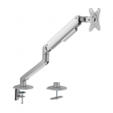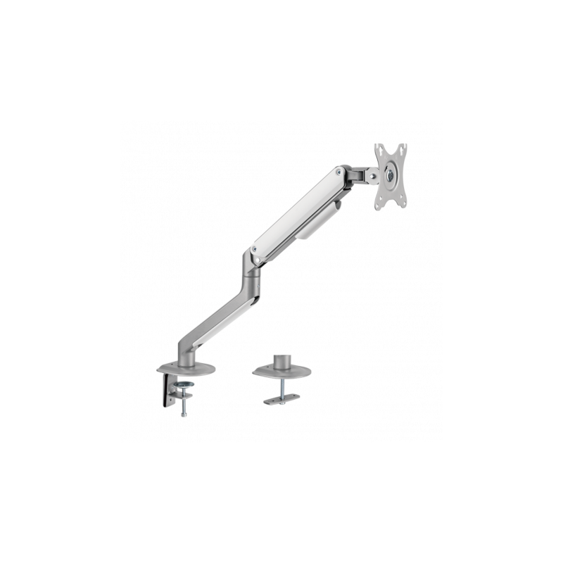 Brazo para monitor con instalación en mesa, diseñado para facilitar el ajuste ergonómico y flexible del monitor. Brinda soporte por medio de una base o abrazadera en el escritorio, permitiendo así múltiples posiciones en altura, inclinación, giro y distancia. El sistema con resorte mecánico asegura un movimiento suave y preciso, haciendo posible ajustar la pantalla según las necesidades del usuario.