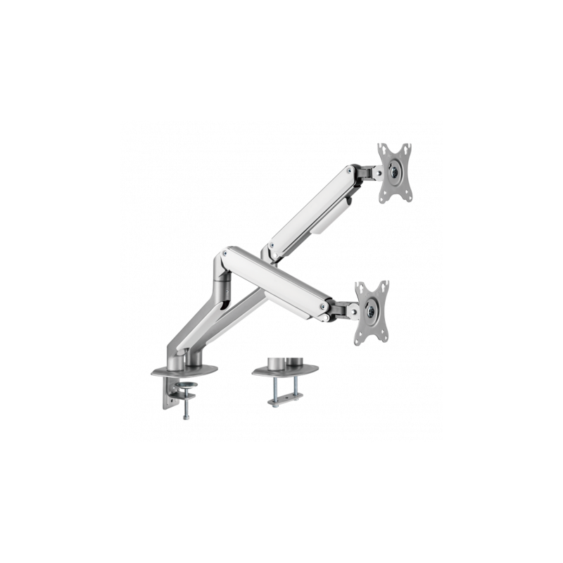 Soporte de doble brazo para monitor de instalación en mesa, diseñado para ajustar dos monitores de manera ergonómica. Permite fijación segura al escritorio mediante base o abrazadera, facilita desplazamiento en altura, inclinación, giro y distancia para mayor flexibilidad en la posición de pantalla.