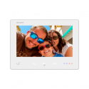 Monitor para videoportero con pantalla táctil TFT de 7 pulgadas, audio bidireccional, BIM para usuarios con audífono, indicadores LED de estado. Funciona con tecnología de 2 hilos HD, permite el uso de tarjeta microSD hasta 128 GB y montaje en superficie. Diseño en color blanco, facilita la comunicación segura y clara para el personal del edificio, con extensión para conectar hasta 4 monitores en serie, compatible únicamente con el sistema de 2 hilos HD.