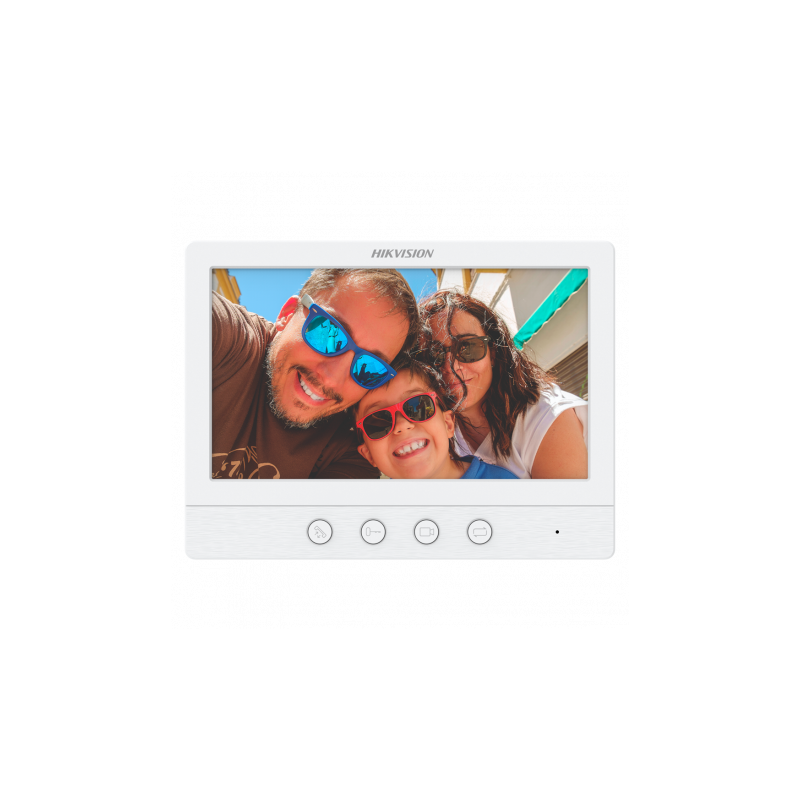 Monitor para videoportero con pantalla TFT de 7 pulgadas a color, audio bidireccional, botones físicos, funcionamiento a través de 4 hilos analógico, montaje en superficie y acabado en color blanco. El monitor de videoportero se instala en interiores y actúa como unidad interior, permitiendo recibir llamadas de visitantes dentro del edificio. Este modelo cuenta con botones físicos para operación sencilla, permite comunicaciones claras gracias a su micrófono y altavoz integrados, es compatible con instalaciones convencionales de 4 hilos y permite extensión a múltiples pantallas, llamadas internas y conexión a una cámara analógica externa.