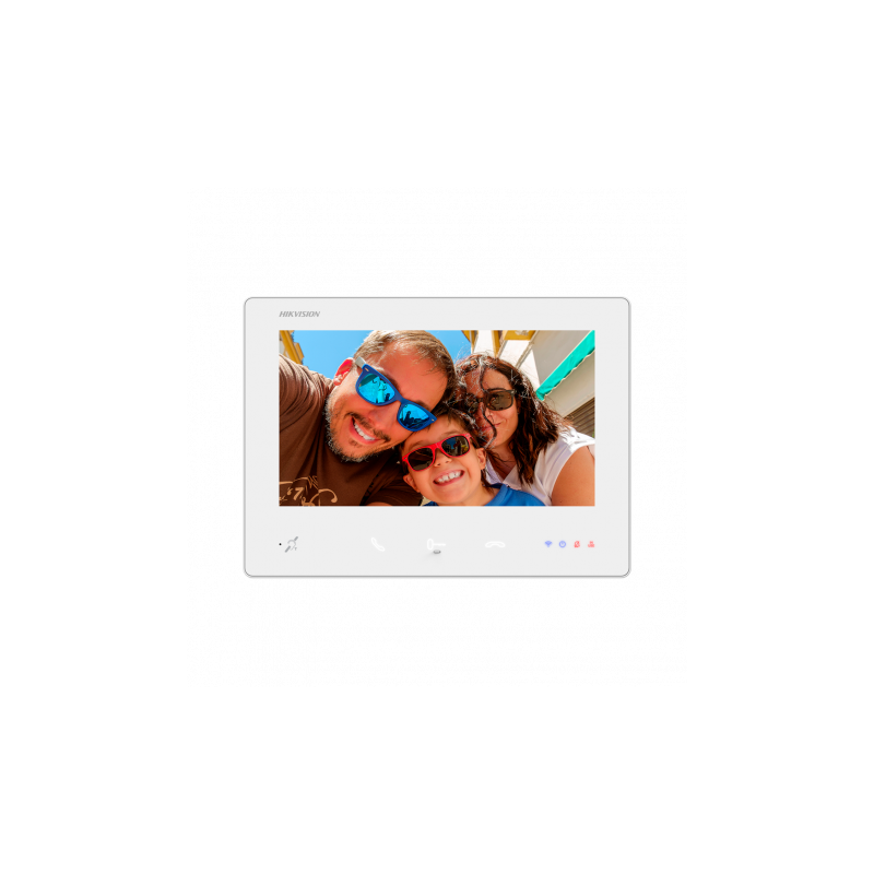 Monitor interior para videoportero, pantalla TFT táctil de 7 pulgadas con resolución de 1024 x 600, audio bidireccional, micrófono y altavoz integrados, función BIM para personas con audífono, indicadores LED de estado, grabación y captura de imágenes, conexión de 2 hilos HD y WiFi para integración con la aplicación móvil Hik-Connect, ranura microSD de hasta 128 GB, admite hasta 4 monitores conectados en serie, montaje en superficie, acabado en color blanco, manejo sencillo desde el interior de la vivienda o instalación, comunicación y alimentación por cableado convencional de cobre.