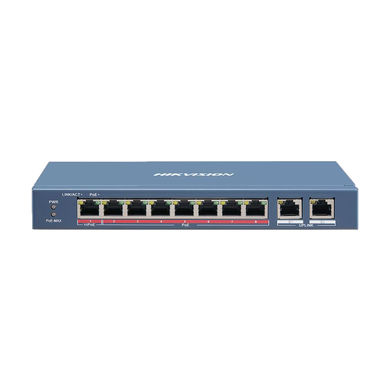 Switch PoE de 8 puertos de cobre 10/100. 8 puertos PoE+ extendido 250 metros. 2 puertos 10/100/1000. PoE 110 W máximo. L2 sin gestión.