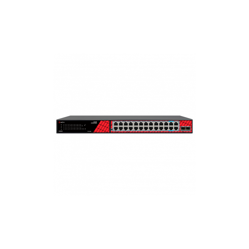 Switch Hi-PoE Safire, sobremesa, 24 puertos RJ45 PoE gigabit 10/100/1000 Mbps, 22 puertos PoE+ hasta 30 W, 2 puertos Hi-PoE hasta 60 W, 2 uplink RJ45 y 2 uplink SFP hasta 2,5 GE, PoE Watchdog, PoE extendido a 10 Mbps hasta 250 metros, hasta 300 W potencia PoE total, gestión inteligente de energía y protección avanzada, incluye cable AC e instrucciones de uso.