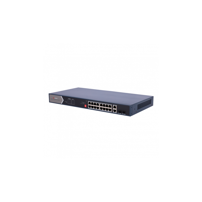 Switch no gestionable Hikvision con 18 puertos RJ45 Gigabit y 2 puertos SFP Gigabit, 12 puertos PoE+ compatibles con 802.3af y 802.3at más 4 puertos Hi-PoE hasta 90W, totalizando una potencia PoE de hasta 225W, capacidad de PoE extendido hasta 300 metros, funciones de PoE Watchdog, Port Isolation para mayor seguridad en la red y formato enrackable, recomendado para soluciones de videovigilancia y redes comerciales.