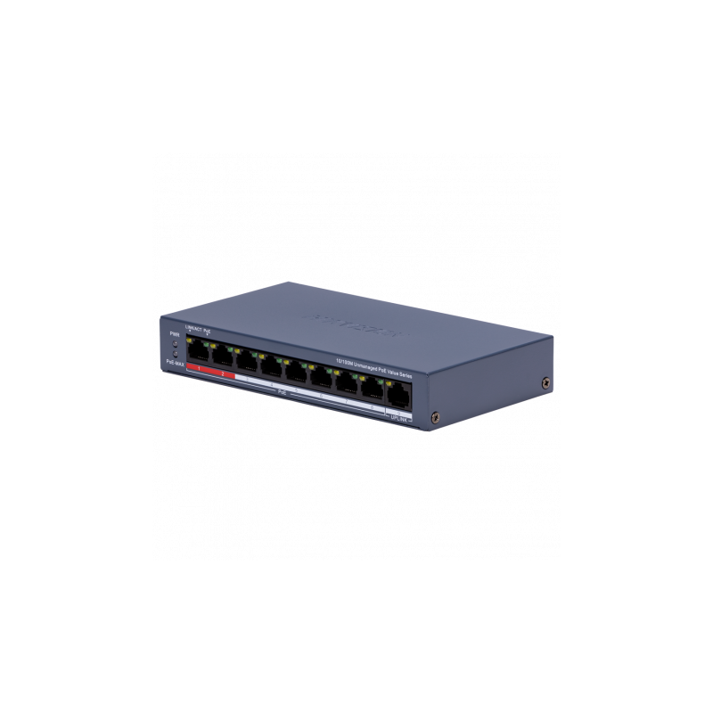 Switch PoE Hikvision, 8 puertos PoE y 1 uplink, velocidad 10/100 Mbps, alimentación total de 80 W, hasta 300 metros, IEEE802.3af/at.
