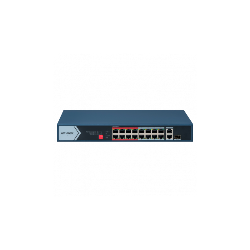 Switch PoE Hikvision con 16 puertos RJ45 Fast Ethernet y 2 puertos Gigabit para enlaces ascendentes, funciones PoE extendido, PoE Watchdog y aislamiento de puertos, transmisión de datos y energía a través de cables Ethernet, compatible con IEEE 802.3af/at y total de hasta 130w de potencia PoE, montaje en sobremesa o pared, solución apta para sistemas de videovigilancia y redes de dispositivos PoE.