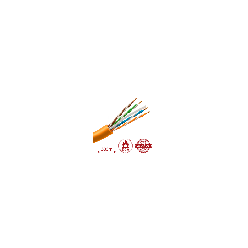 Bobina de cable UTP Categoría 6, longitud 305 metros, conductor 24AWG, cubierta LSZH, color naranja, aislamiento del conductor en HDPE, CPR Dca-S1, d2, a1, cumple Fluke test 90 metros, certificaciones ISO/IEC11801, TIA-568-C.2, YD/T1019