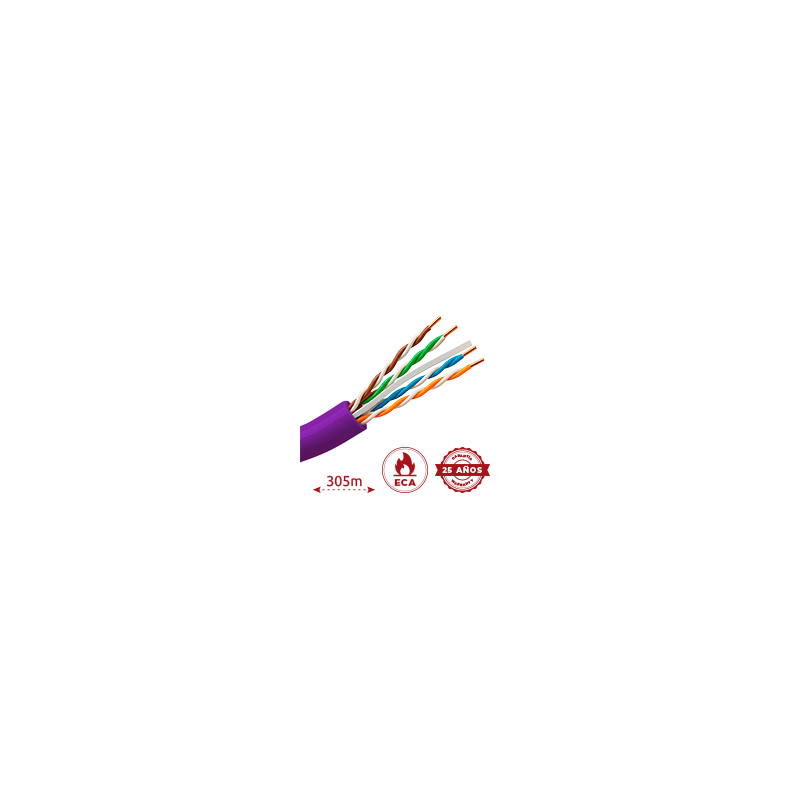 Bobina de cable UTP categoría 6, CPR Eca y 90 metros Fluke test, BC 4 pares 24AWG flexible, HDPE y PVC, 5 mm, 305 metros, moradoRecipiente :