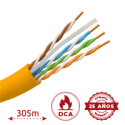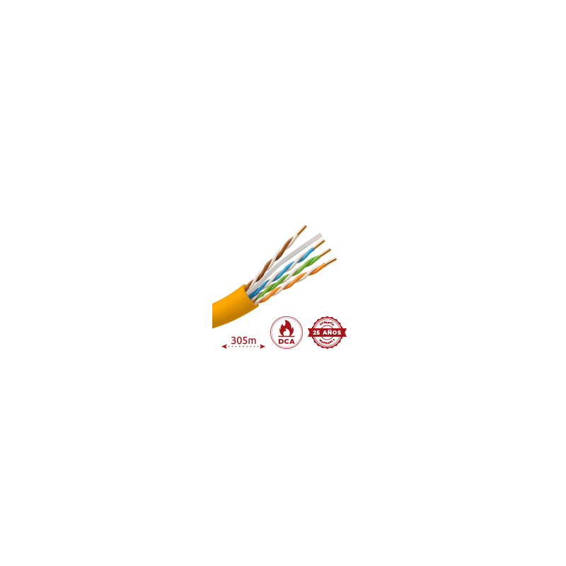 Bobina de cable UTP categoría 6, 4 pares CCA 24 AWG flexible, diámetro del conductor 0,50 mm, cubierta exterior LSZH, aislamiento HDPE, longitud 305 metros, color naranja, certificación CPR clase Dca S1 d2 a1, cumple con 90 metros Fluke test, presentación en caja de cartón.