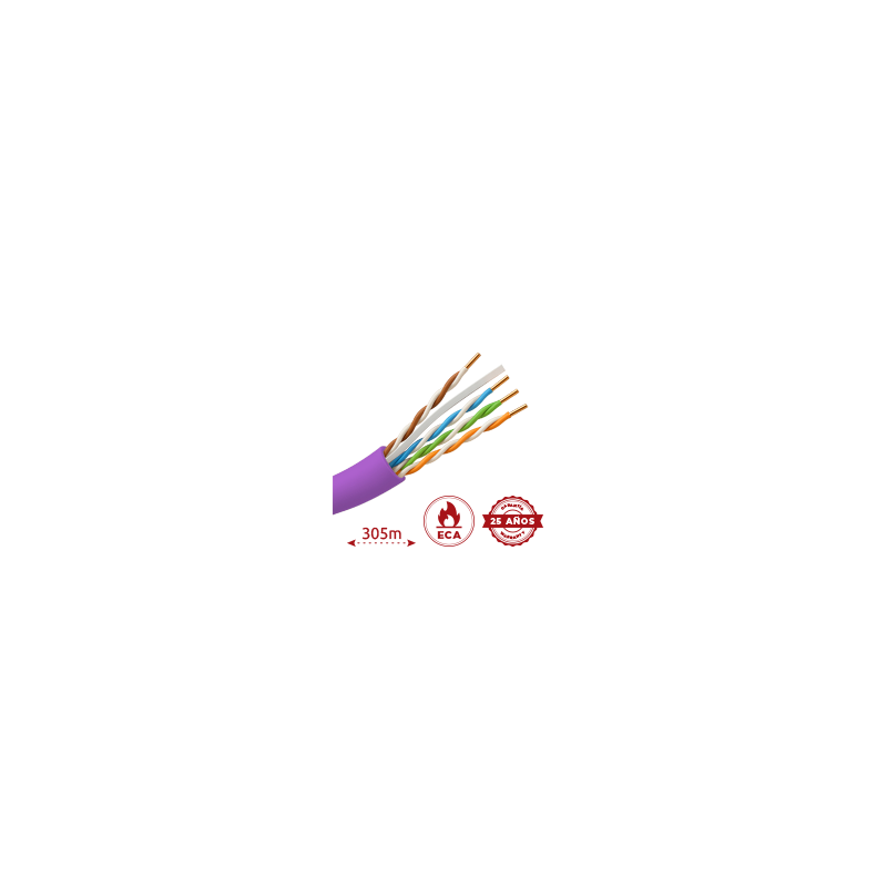 Bobina de cable UTP Categoría 6 para instalaciones de red, 305 metros, conductor CCA 4 pares 24 AWG flexible, aislamiento HDPE, cubierta exterior PVC, color morado, certificado CPR Eca, cumple con 90 metros Fluke test.