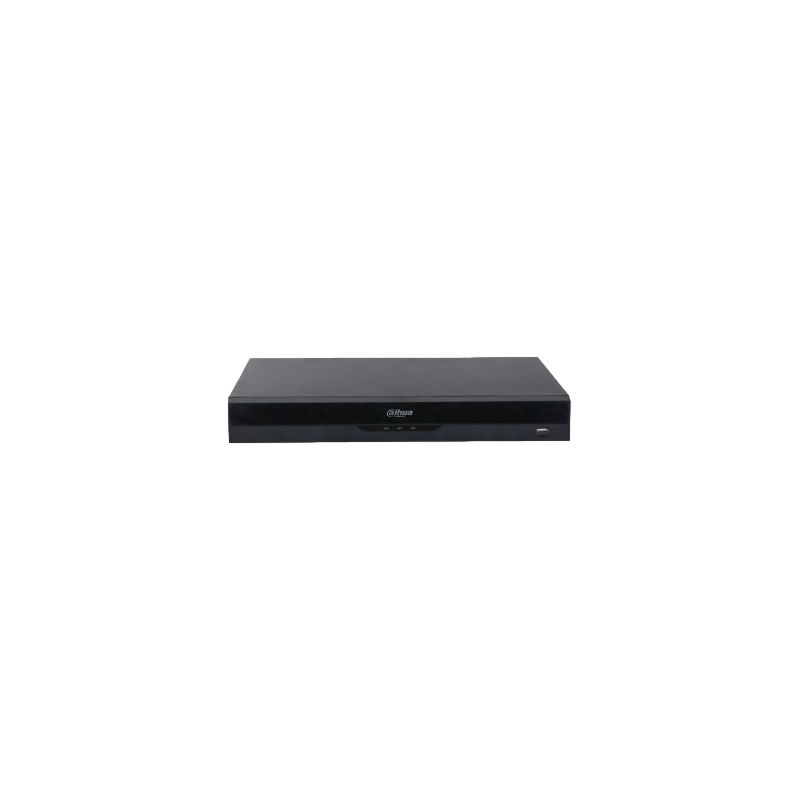 NVR Dahua WizSense con capacidad para 32 canales IP, resolución compatible hasta 32MP, codificación de hasta 40 canales 1080P a 30 imágenes por segundo, ancho de banda de 448 Mbps y salidas de vídeo HDMI 8K y VGA. Incluye doble puerto Ethernet con agregación de enlace y tolerancia a fallos, audio bidireccional y metadatos. Ofrece funciones analíticas avanzadas con AcuPick, SMD Plus, detección facial y EPI. Soporta Onvif y software VMS, alimentación de 12 VDC.