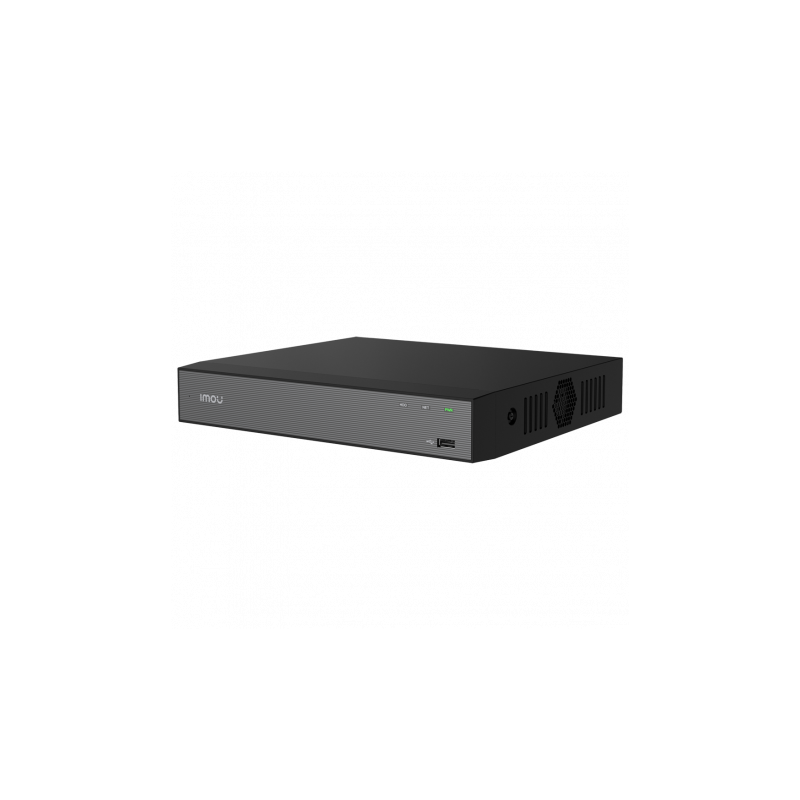 Grabador NVR Imou de 8 canales para cámaras IP, equipado con compresión H.265 y H.264, compatible con una resolución máxima de 8 megapíxeles, salida de vídeo simultánea mediante HDMI 4K y VGA, capacidad para un disco duro interno de hasta 16TB, admite acceso remoto por aplicación móvil Imou Life, integración con software para PC, compatible con cámaras Imou, Dahua, X-Security y dispositivos ONVIF, almacenamiento en nube con Imou Protect bajo subscripción, interfaz de red LAN RJ-45, ancho de banda soportado de 90 Mbps, incluye control por ratón y métodos de grabación manual, programada o por detección de movimiento.