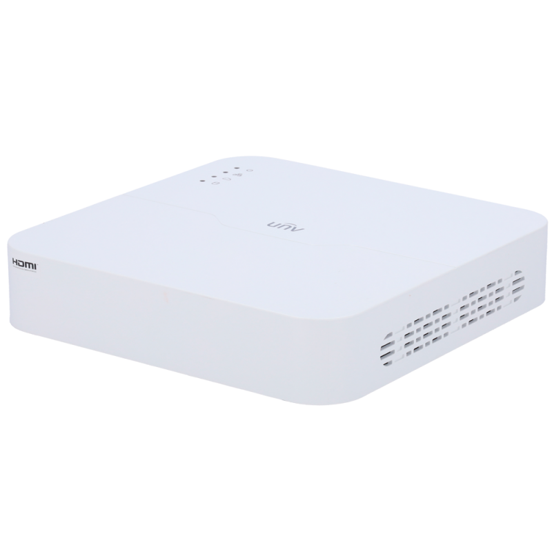 AcuSearch, NVR Uniview de la gama Easy, 4 canales, 4 canales PoE, ancho de banda de 80 Mbps, resolución máxima 12 MP, compresión Ultra H.265 H.265 H.264, funciones inteligentes con detección facial, detección de vehículo, conteo de personas y monitoreo de tráfico, SIP hasta 2 canales y UMD hasta 4 canales, salida HDMI 4K y VGA, espacio para 1 HDD de hasta 10 TB, interfaz web CMS smartphone y NVR, compatible con ONVIF y RTSP