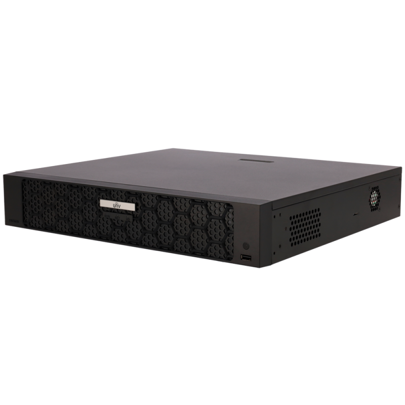 Grabador NVR Uniview gama Prime, 16 canales IP con 16 puertos PoE IEEE802.3af/at, ancho de banda entrante de 320 Mbps con funciones smart apagadas y 160 Mbps con funciones smart encendidas, compresión Ultra265 H.265 H.264, resolución de grabación hasta 16 megapíxeles, compatible con cámaras LPR y reconocimiento facial, tecnología ANR, salida HDMI 4K y VGA, compatible con ONVIF y RTSP, espacio para 4 HDD de hasta 16 TB, soporta RAID, incluye ratón y cable de alimentación