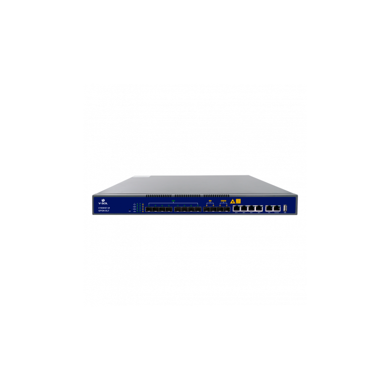 OLT GPON V-SOL, 8 puertos, 4 RJ45 GE, 2 SFP/GE, 2 SFP+, hasta 128 ONT, transmisión hasta 20 km, alimentación AC de 100 a 240 V.