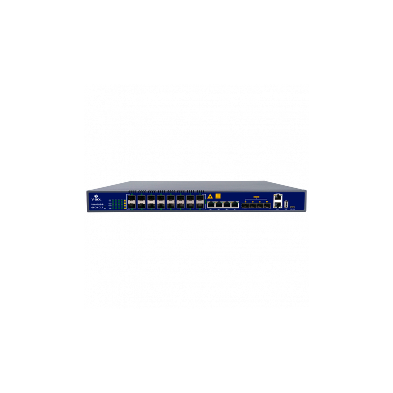 OLT GPON V-SOL 16 puertos, 4 RJ45 GE, 4 SFP+ hasta 10G, hasta 128 ONT, transmisión hasta 20 km, AC de 100 a 240 V.