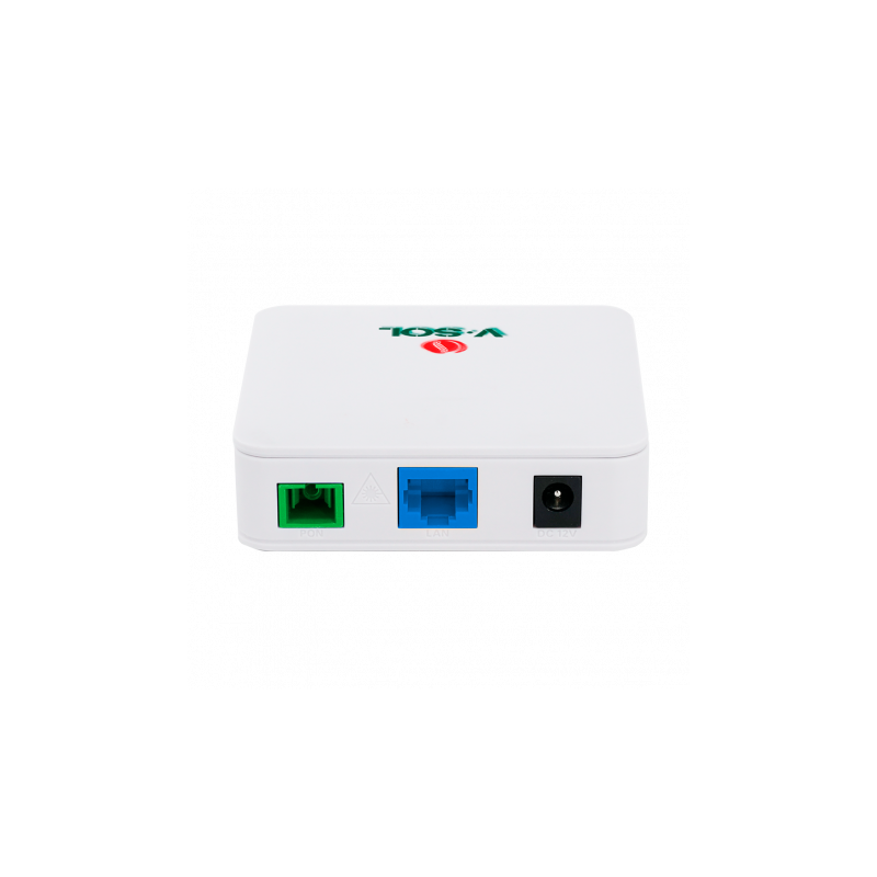 ONT XPON V-SOL, 1x PON, 1x LAN RJ45 hasta 2500 Mbps, transmisión hasta 20 km, alimentación DC 12 V, ideal para FTTH.