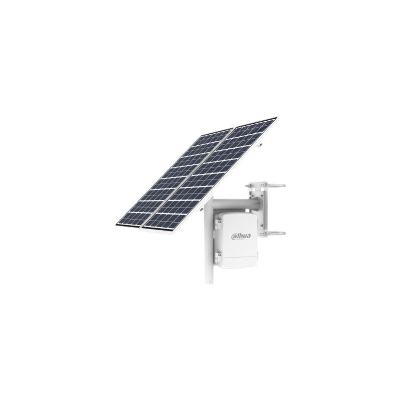 Sistema solar integrado Dahua de 120 W, diseñado para ofrecer alimentación estable en zonas sin acceso a red eléctrica, estructura resistente y fácil de instalar, admite hasta 4 baterías de litio no incluidas, compatible con puente inalámbrico Dahua, controlador MPPT incorporado, función de calefacción automática e indicadores LED visuales, ofrece protección IP66.