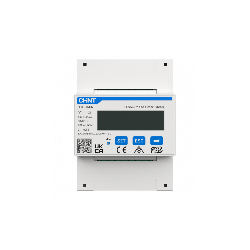 Medidor inteligente trifásico Anker Solix compatible con inversor ASOX-H8K, con función bidireccional, instalación sobre carril DIN, precisión clase B, permite mediciones multifunción y visualización a través de display LCD, integra comunicación Modbus RS485, solución adecuada para gestión y monitorización de energía en sistemas fotovoltaicos y entornos industriales.