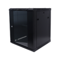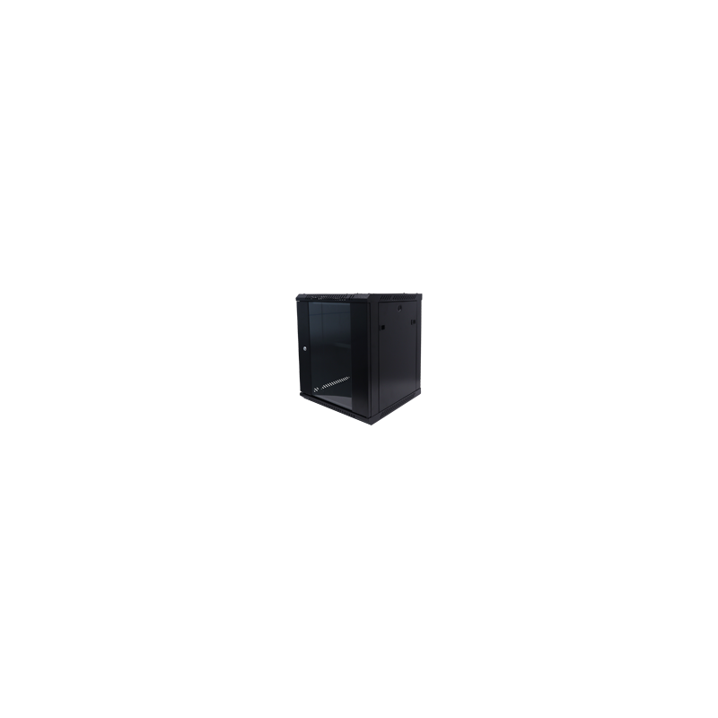 Gabinete rack de 9U para infraestructuras de red y servidores, formato flat pack para transporte y manipulación en espacios reducidos, ensamblaje sencillo en destino, estructura en acero laminado en frío SPCC, carga máxima 60 kg, instalación en suelo o pared, ventilador incorporado para refrigeración activa, PDU europeo de 1U con 6 tomas, adecuado para switches, terminales de cableado y gestión multimedia.