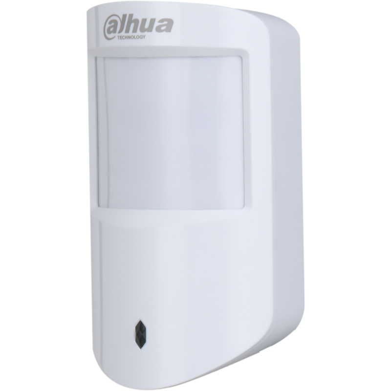 Detector vía radio Dahua de doble tecnología. Alcance de detección de 12 metros, 90°. Función antimascotas. Compensación automática de la temperatura. Sensibilidad ajustable en 3 niveles. Detección de la intensidad de la señal. alarma de batería baja. Medición de la temperatura. Salto de frecuencia y comunicación bidireccional.