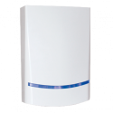 Sirena cableada para exterior, diseñada para sistemas de seguridad con nivel sonoro máximo de 100 dB, incorpora luz de aviso frontal en color rojo, certificación de grado 2, alimentación de 13,8 VDC con respaldo mediante batería de 12 VDC, no incluida, carcasa en color blanco resistente a exteriores, grado de protección IP54.