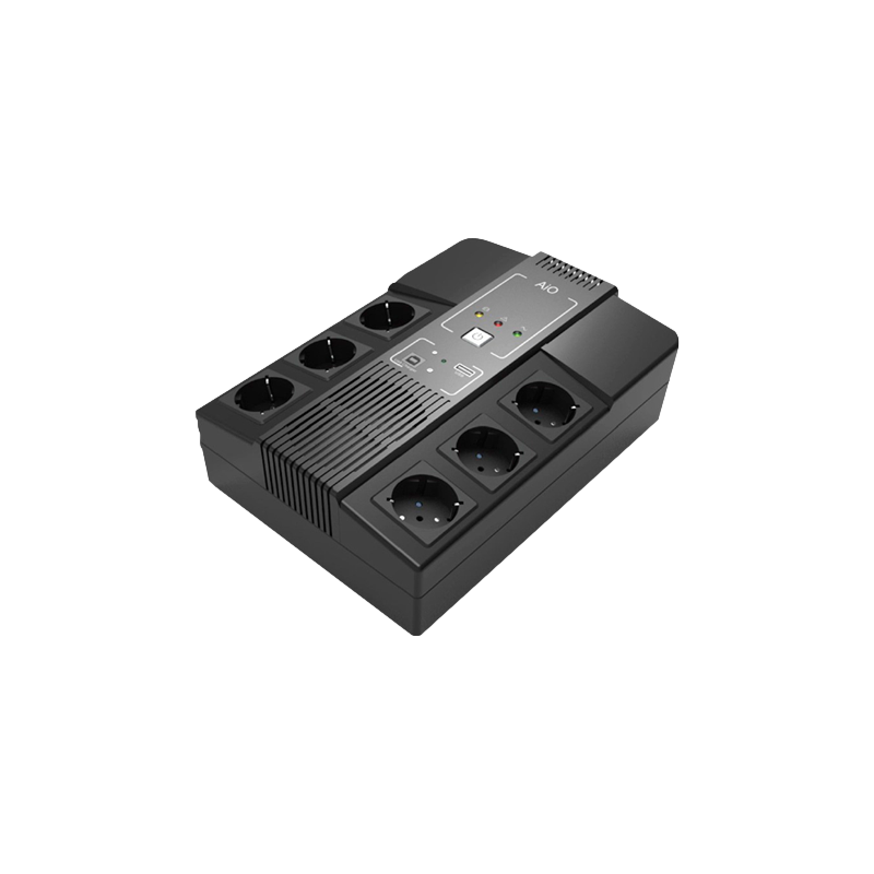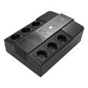 SAI monofásico line-interactive. Potencia 600VA/360W, Entrada 220 a 240 Vac, Salida 230 Vac, 6 salidas SAI/UPS protegidas, Tiempo de recarga 6 a 8 h, Batería de plomo-ácido sellada.