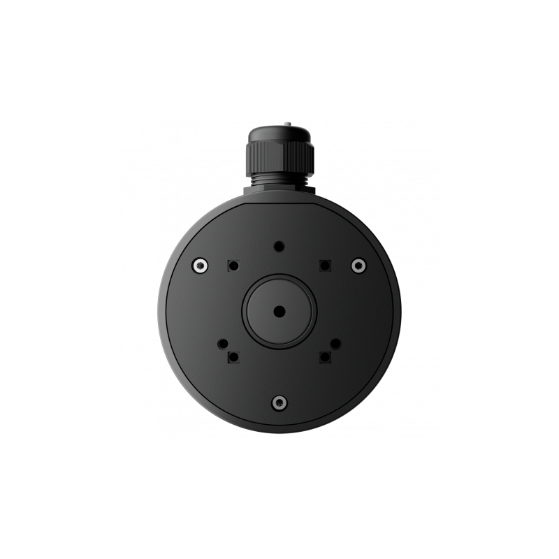 Caja de conexiones diseñada para cámaras Bullet, Domo y Turret, fabricada en aleación de aluminio, apta para instalaciones en techo o pared, uso exterior e interior, incluye prensacable y ofrece opciones de montaje en la parte superior o el lateral. Su color negro se integra en entornos profesionales, soporte para columnas de hormigón y protección IP66, dimensiones de 118 milímetros de diámetro por 59 milímetros de fondo, peso de 468 gramos.
