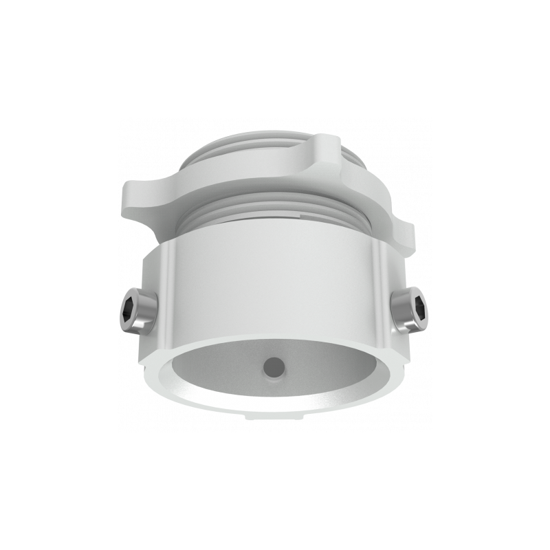 Rosca adaptadora para domos motorizadas Hikvision, aleación de aluminio 6061, 75 mm x 53 mm, peso 175 gramos, color blanco.