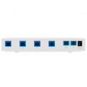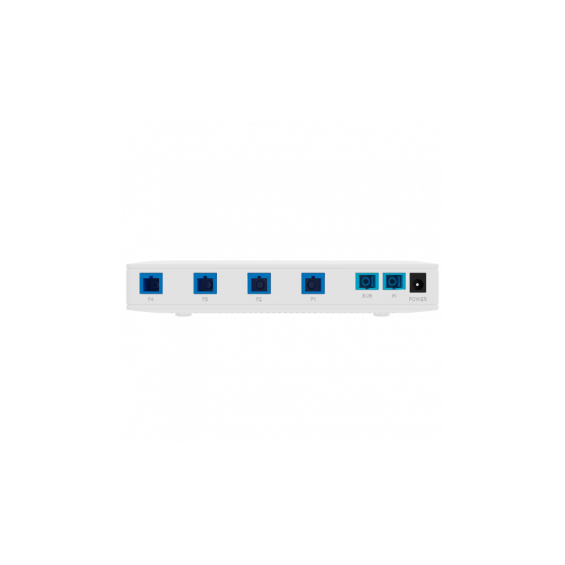 Splitter de fibra óptica con alimentación, de 1260 a 1650 nm, 2 conectores SC uplink, 4 salidas SC PON, instalación en pared o sobremesa.