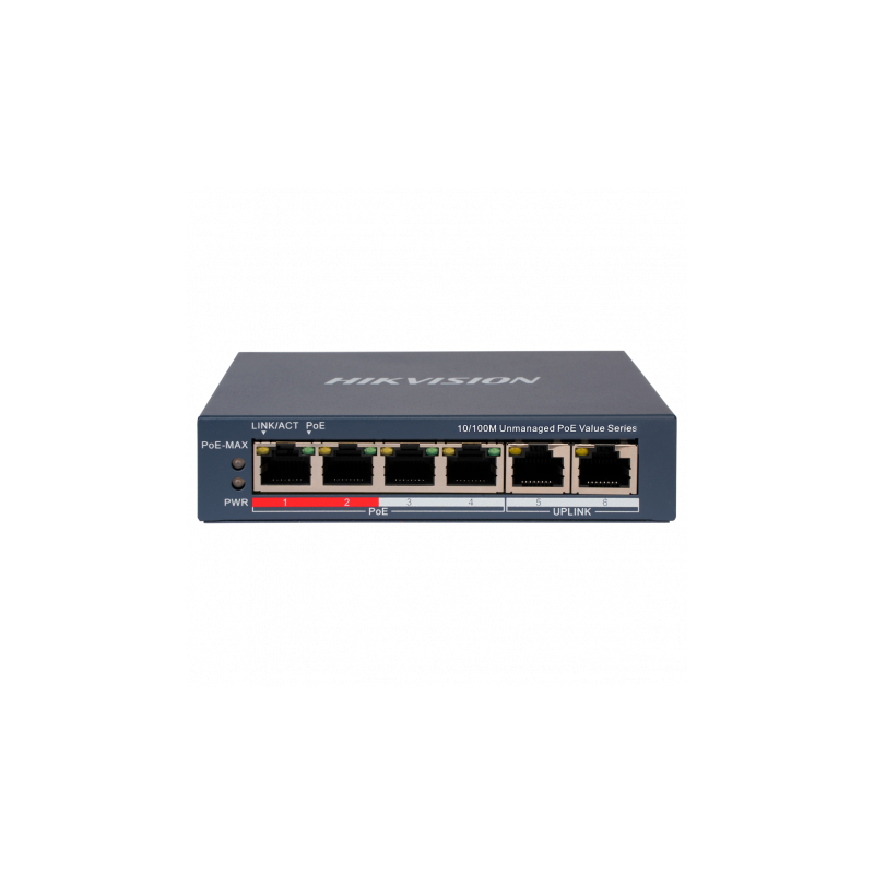 Switch de sobremesa Hikvision con 4 puertos PoE y 2 puertos uplink RJ45, velocidad de 10 a 100 Mbps, hasta 45 W en total para todos los puertos. Compatible con PoE IEEE 802.3af y IEEE 802.3at, facilita la conexión y alimentación de dispositivos de red, en un formato compacto y sin necesidad de configuración. Su diseño sin ventilador y carcasa metálica ofrecen funcionamiento silencioso, protección contra sobretensiones de 6 kV y posibilidad de transmisión PoE de hasta 300 metros, preparado tanto para sobremesa como montaje en pared.