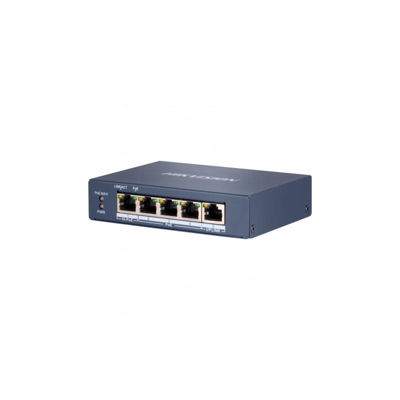 Switch PoE de 5 puertos Hikvision diseñado para redes de videovigilancia IP y aplicaciones que requieren alimentación a través de Ethernet. Incorpora 4 puertos PoE Gigabit, uno de ellos Hi-PoE compatible con IEEE 802.3af/at/bt y capaz de suministrar hasta 60 W a un solo dispositivo, mientras los otros tres soportan hasta 30 W por puerto. Integra también un puerto uplink Gigabit para una conectividad segura y estable en entornos pequeños y medianos. Permite funciones como PoE extendido, PoE Watchdog y aislamiento de puertos para una mayor seguridad y capacidad de adaptación. El chasis metálico robusto, el funcionamiento sin ventilador y su diseño plug-and-play hacen de este switch una opción fiable para instalaciones donde se requiere alimentación PoE mientras se mantiene una velocidad de transmisión estable y una gestión eficiente del tráfico.